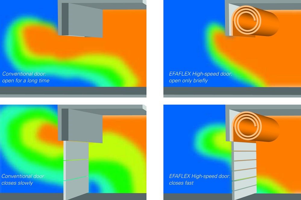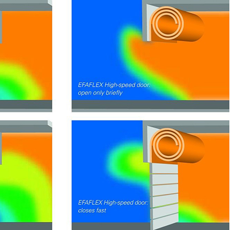 EFAFLEX produce the fastest vertically opening door in the world. With door opening speeds of up to 4 meters per second, this fast action has a significant benefit – reducing exposure to the elements. This minimizes the need to heat or manage cool areas in climate-controlled environments such as warehouses, cleanroom applications, and food production by up to a staggering 50%. Think of the knock-on benefits too, that of reducing CO2 emissions, making the working environment more comfortable for staff, and it becomes easy to calculate the whole life financial and environmental benefits that EFAFLEX can deliver.