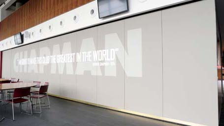 The Woolwich Suite at Arsenal's Emirates Stadium offers banqueting events for up to 600 guests. During its recent refurbishment Becker were commissioned to manufacture and fit two movable walls to allow flexible division of the floor space by providing the option to create up to three separate areas.