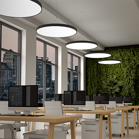 Oculus can be suspended or surface mounted luminaire, designed for architectural impact, enhancing atria, feature spaces, and compliant work environments.